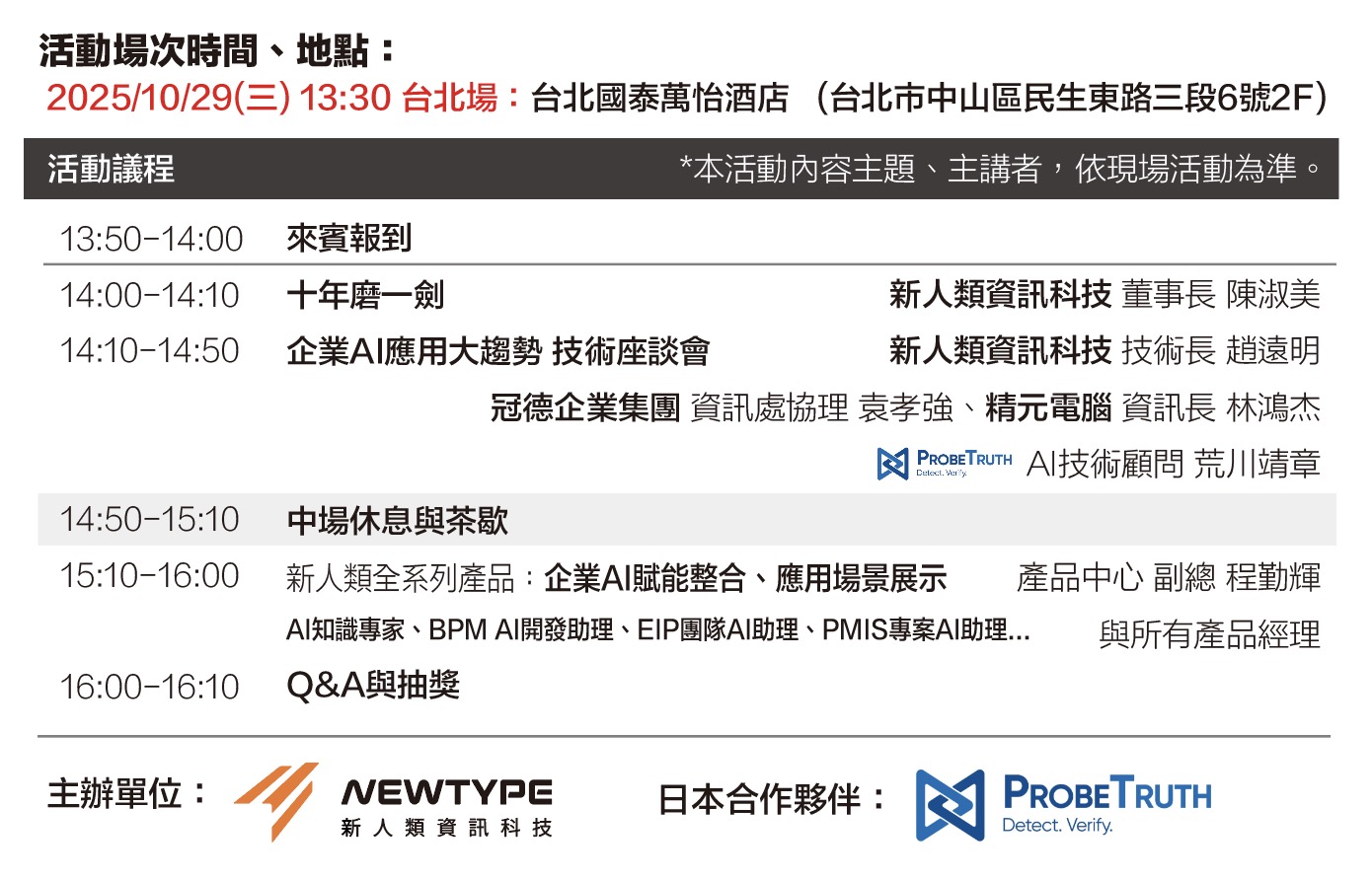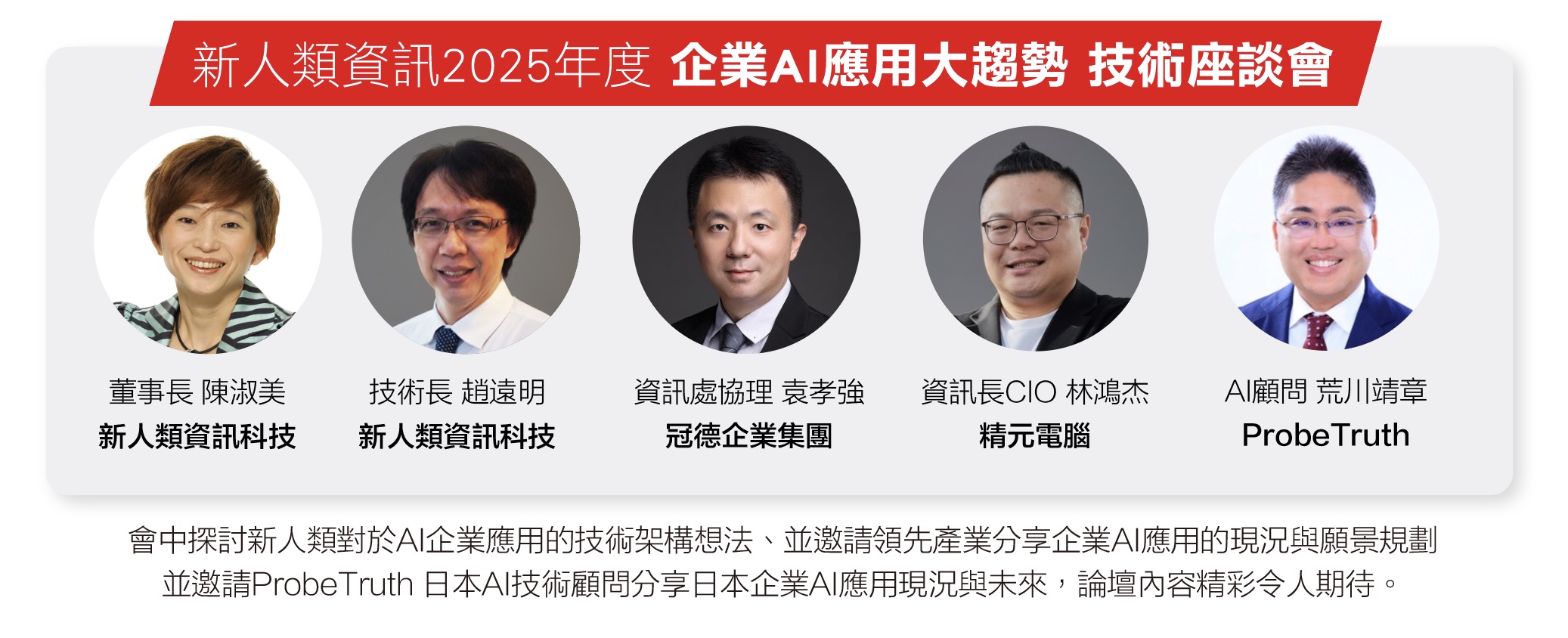 本活動並將邀請領先產業CIO資訊長、專業AI技術專家一同座談,探討未來企業AI技術應用的趨勢,並展示新人類全系列產品的最新AI應用特色與功能,