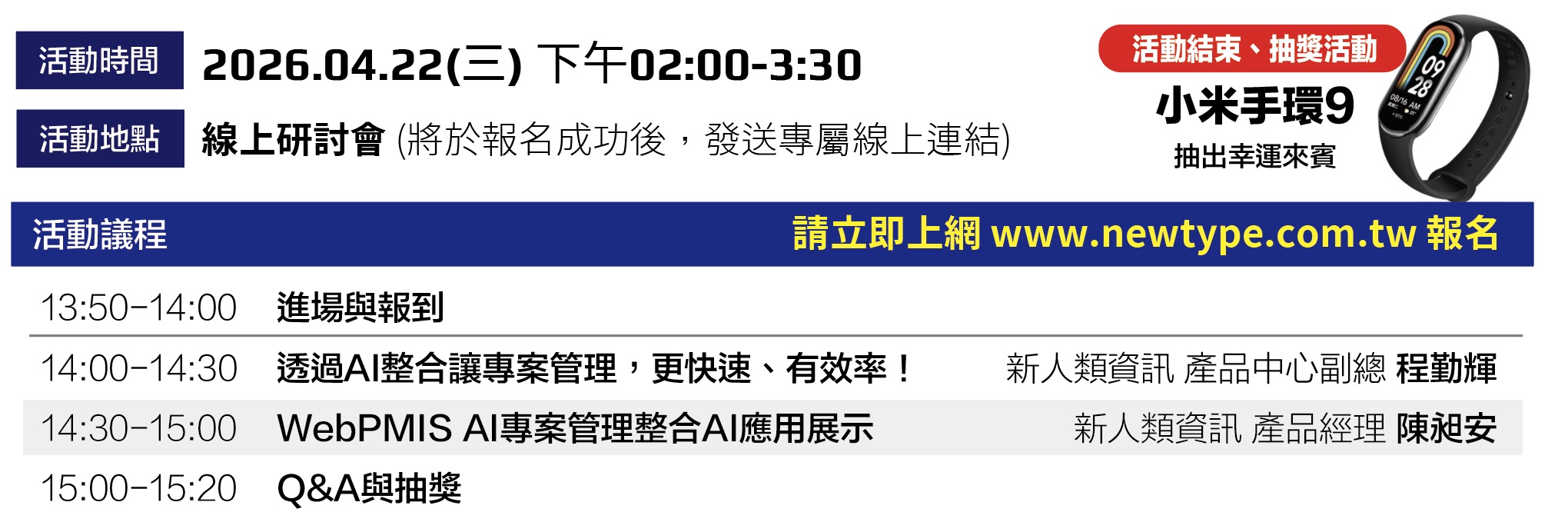 參與新人類【WebPMIS專案AI績效管理】線上AI應用研討會,將可了解: