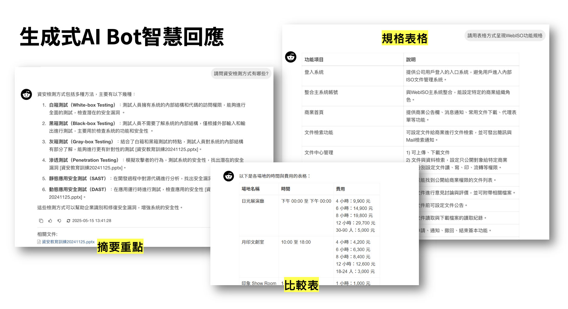 透過 WebISO Pro AI,系統能將複雜內容轉換成清楚易懂的摘要、重點條列、規格比對或相關段落,使用者不必再逐頁翻文件,就能迅速掌握所需資訊。不論是查制度、找流程,或主管需要快速做決策,都能在最短時間取得正確內容,大幅提升整體作業效率。