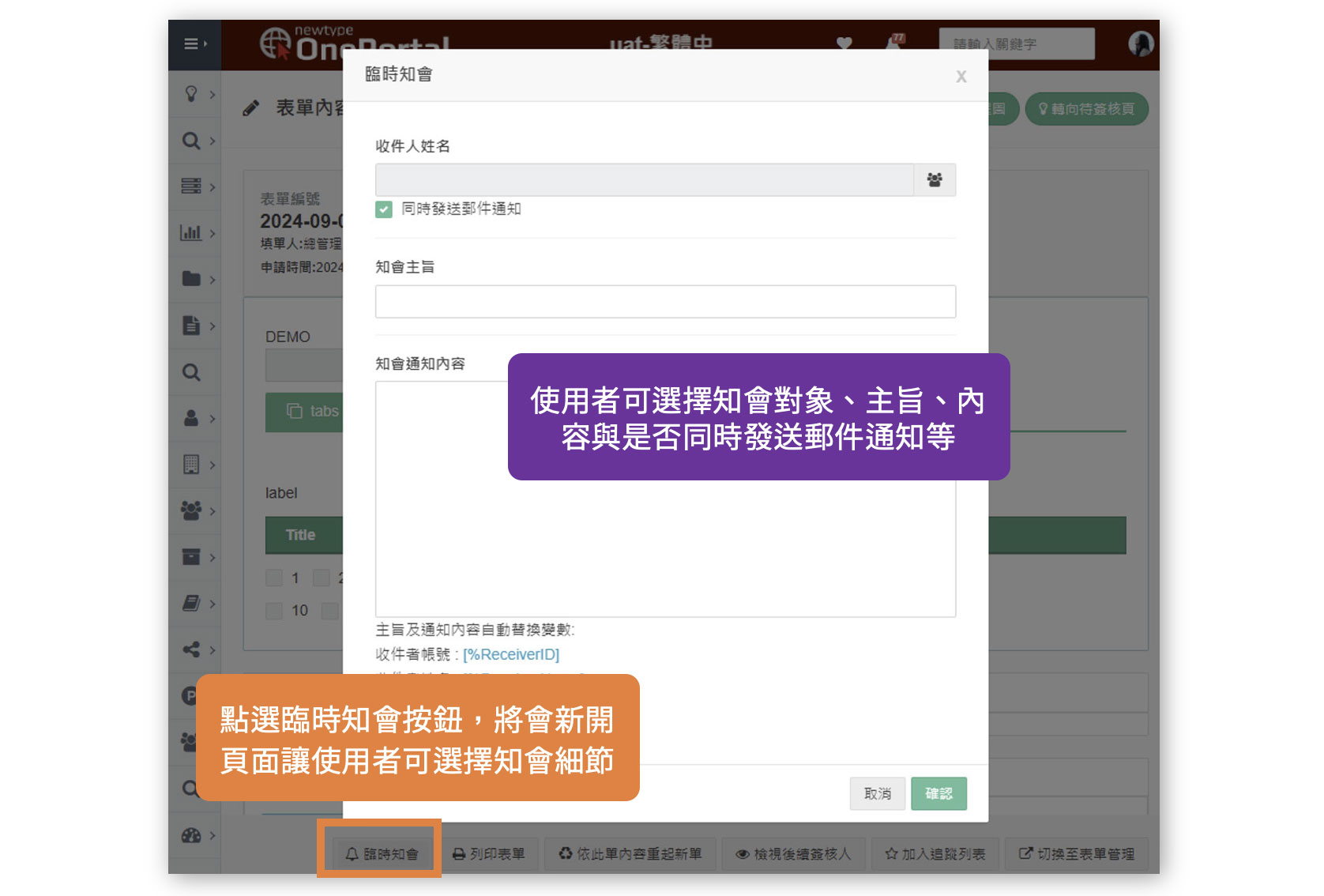 點選臨時知會按鈕後,系統會開啟新頁面,使用者可自行選擇知會對象並填寫主旨與內容,並視需求決定是否同步發送郵件通知,讓訊息能快速傳達。表單管理員另具備指定知會對象的權限,可針對特定表單發送臨時知會,不需等待流程或依賴簽核路徑,使整體通知更加即時且具彈性。