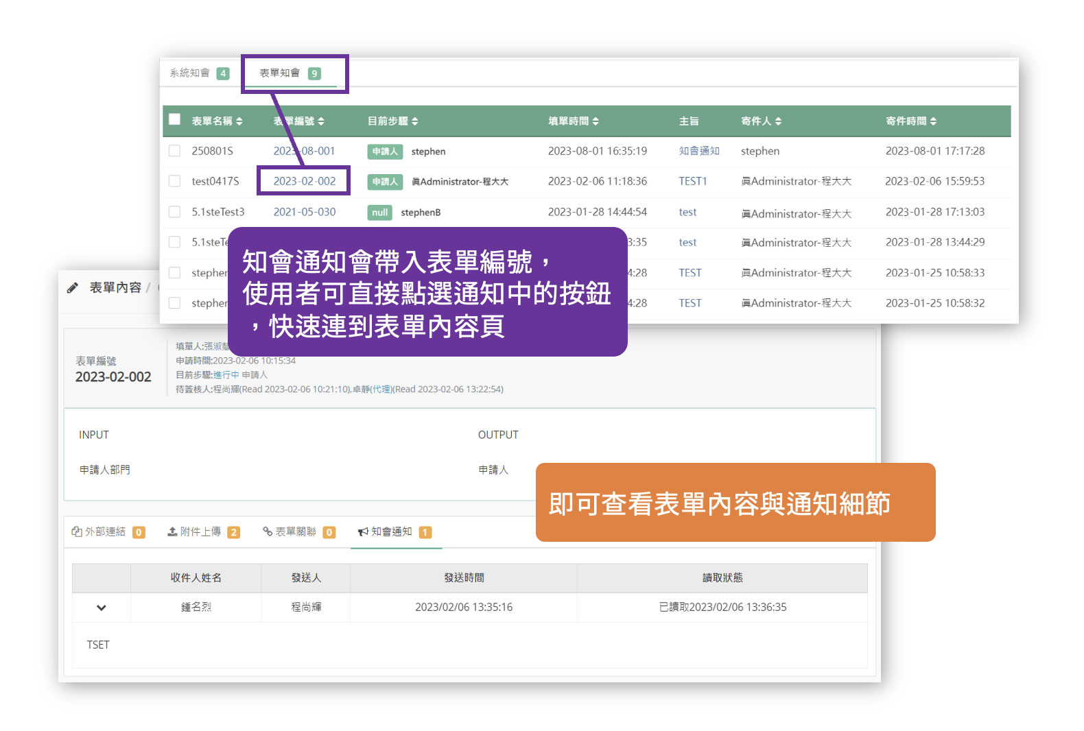 知會通知送出後,被知會的人即可在個人首頁的「知會通知區」看到訊息,系統會自動帶入表單編號,使用者也能從通知中直接點選按鈕跳轉到該表單內容,方便追蹤與處理。