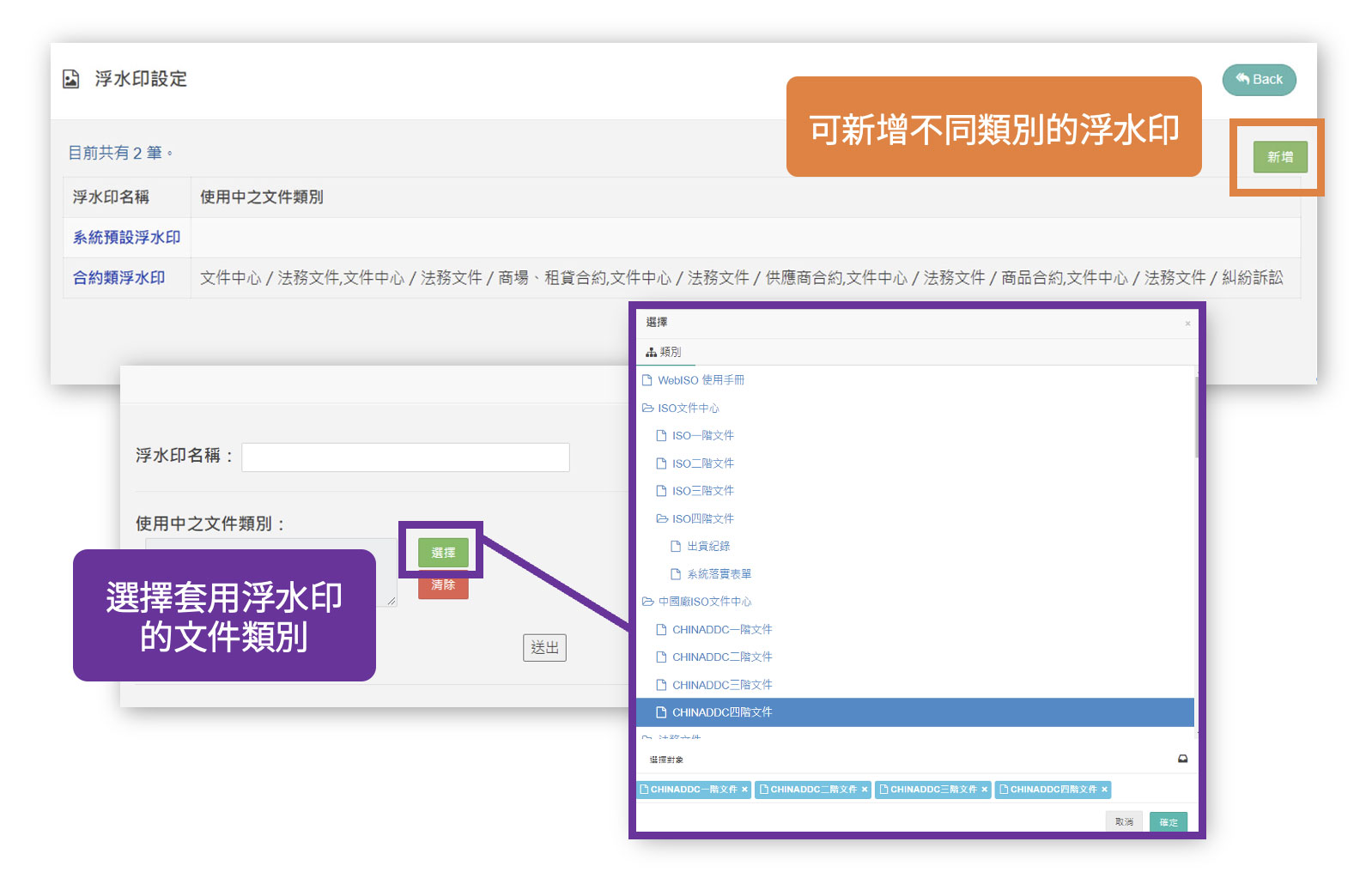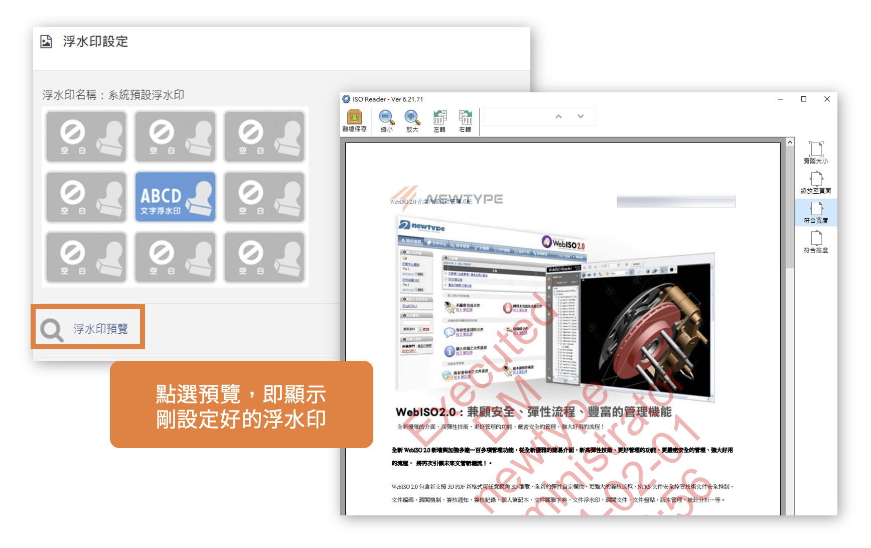此外,WebISO PRO A+文件制度管理平台也支援依不同文件「類別」套用專屬浮水印,企業可依技術文件、內部文件或機密資料等性質,設定不同樣式與內容,當浮水印套用至指定類別後,系統會自動套用至對應文件,大幅降低人工管理負擔。系統也提供預覽功能,讓使用者在設定完成後即可即時檢視效果,確保呈現符合需求。