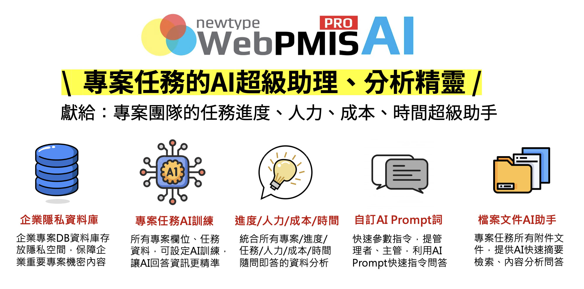 WebPMIS PRO AI以企業專屬的資料庫為核心,導入AI深度理解專案任務、人力、時程、成本與附件內容的能力,使用者僅需提出問題,AI 即可自動擷取任務欄位與專案資訊,將原本必須比對表格、查詢文件、彙整資料的流程,縮短為可立即獲得的即時回應,讓資訊掌握更加快速與完整。