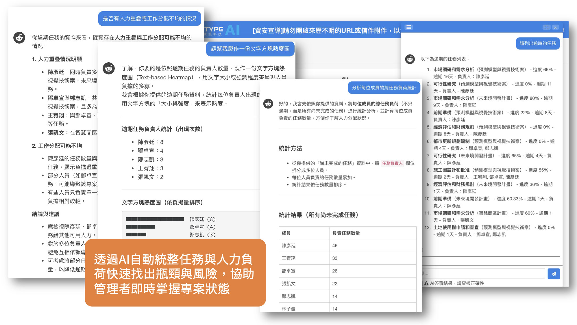 藉由AI的分析能力,管理者能立即獲得人力負荷、任務延誤、資源分配與成本趨勢等洞察,系統能針對每位負責人的待辦與負擔進行統計,產生任務熱度分布、瓶頸判讀與風險說明,協助提前掌握專案壓力點,不論是跨專案的人力分配、預算拆解,或需要快速釐清的異常狀況,AI都能快速提供完整結論與建議。