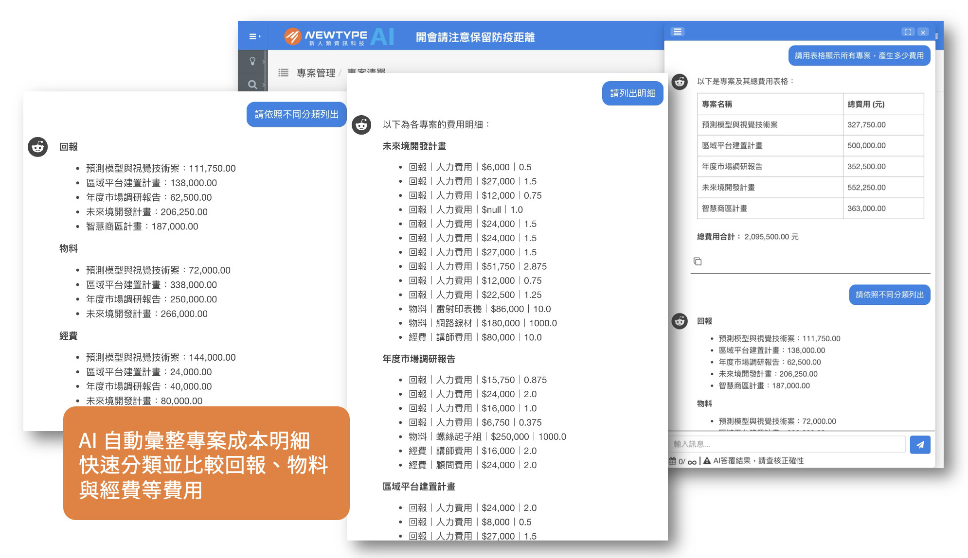 WebPMIS PRO AI亦具備「快速提問 AI」功能,讓主管、PM 與組長可將常用查詢設定為標準指令,例如:「比較三個專案之成本」或「產出本月人力負荷報告」。使用者只需一鍵啟動,即可取得整理完善的數據與報表,免去逐筆查找資料的時間,大幅提升決策效率。