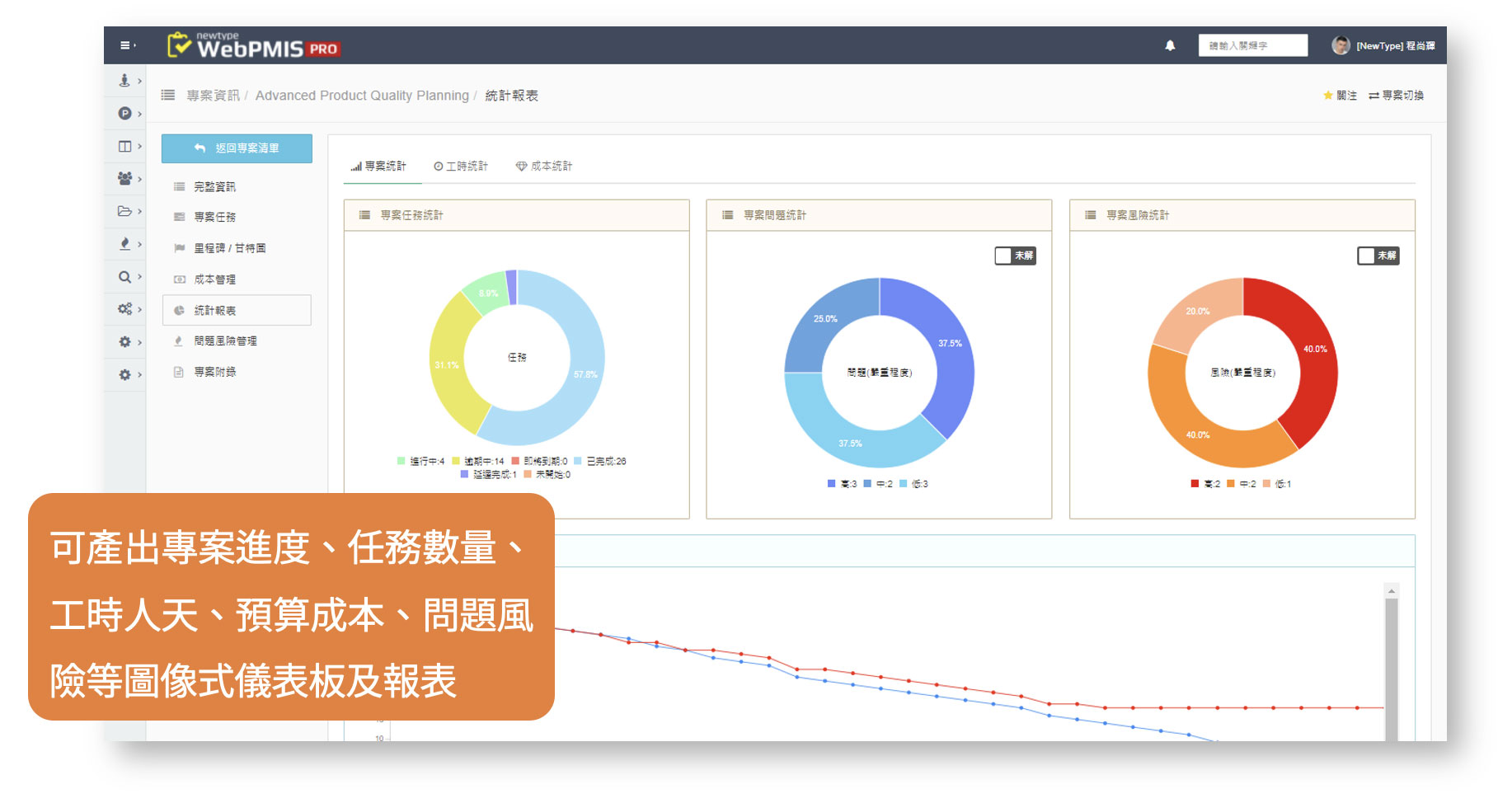 平台同時強化專案績效分析能力,將專案進度、任務數量、工時人天、預算成本及問題風險等關鍵指標,以圖像化儀表板即時呈現,管理者無須彙整分散資料,即可快速掌握專案健康度,並依據數據進行決策調整,讓專案管理從事後追蹤轉為事前預警與即時控管。
