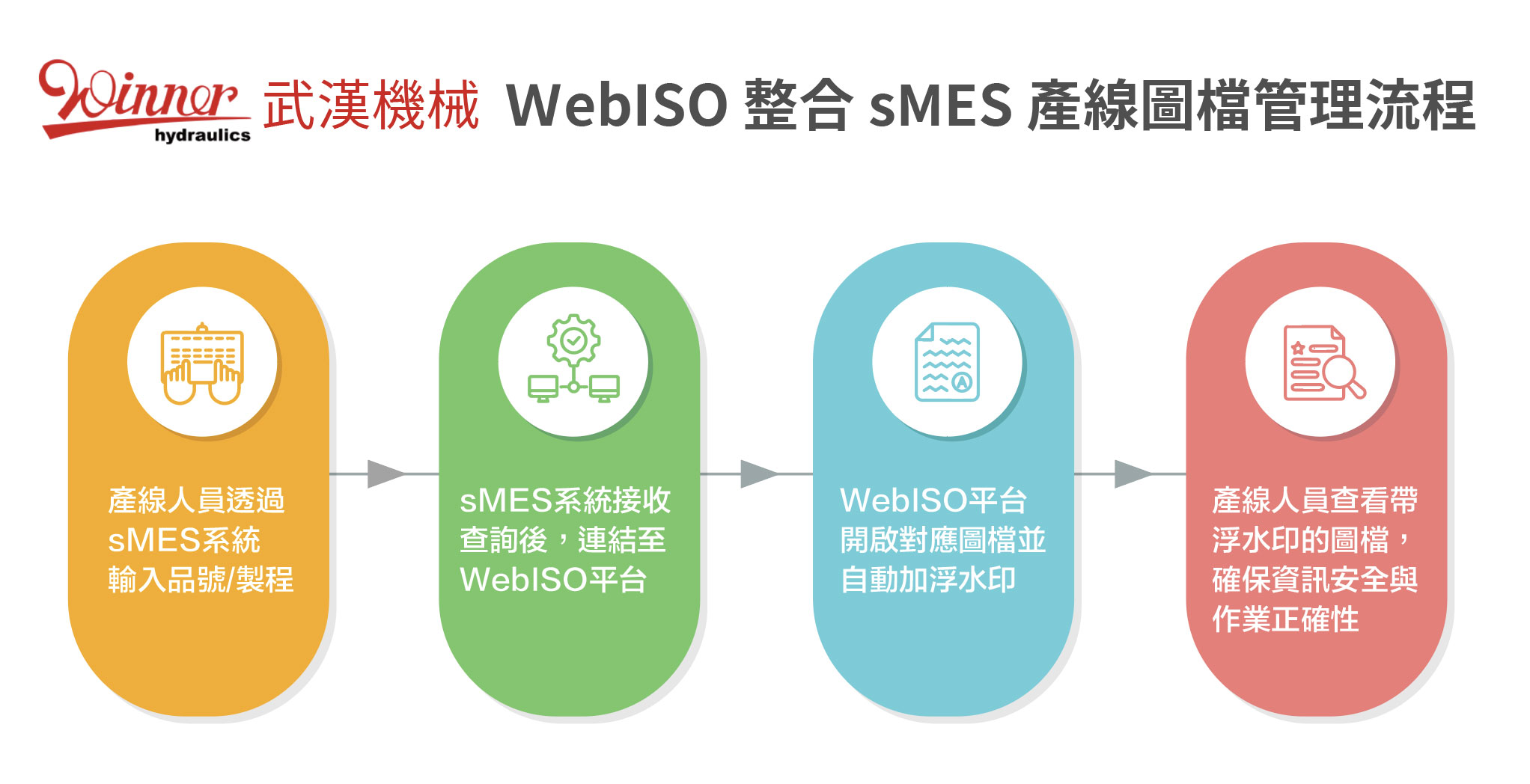 在應用上,武漢機械將鼎新的sMES生產管理系統與WebISO平台進行整合。產線人員透過sMES系統查詢品號或製程時,可直接連結至WebISO平台呼叫對應圖檔,並自動加上浮水印,防止外流或誤用,此設計大幅提升了查圖效率,也同時兼顧資訊安全,讓產線作業更加便利。