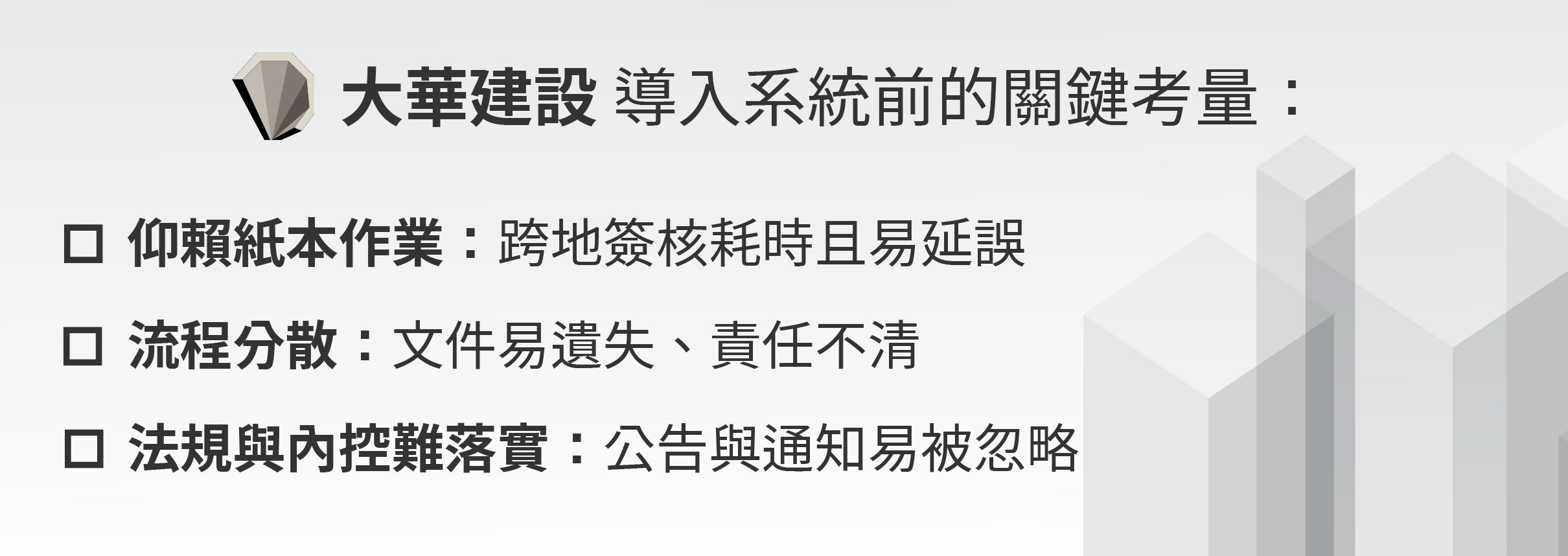 既有作業模式已難以支撐公司對效率、透明度與內控的要求,因此,大華建設將數位化視為強化企業治理的重要手段,期望透過系統化方式落實制度與流程,為長期營運建立更具彈性的管理架構。