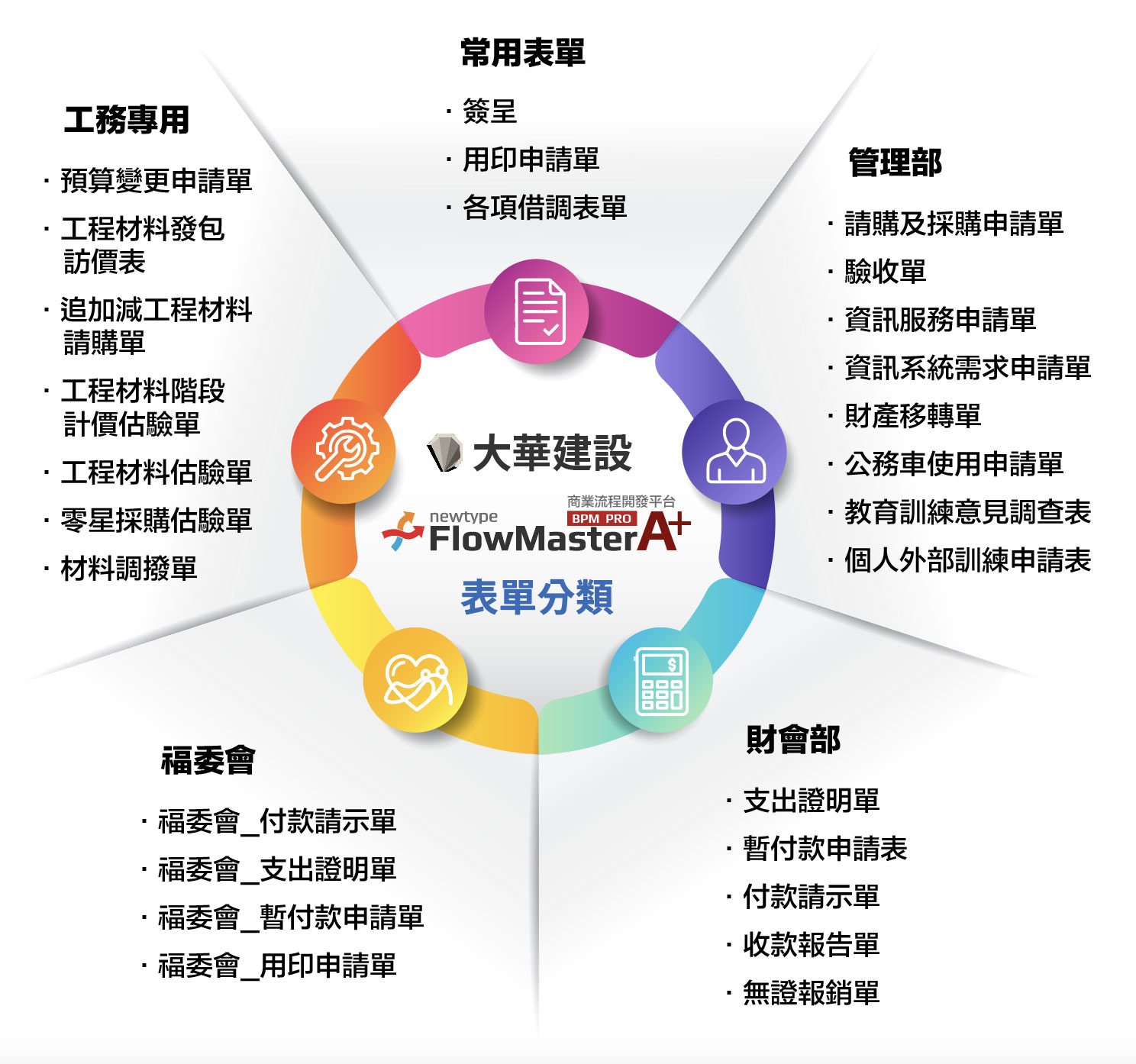 大華建設導入 BPM 與 EIP 系統,將分散的紙本流程全面數位化,整合跨部門與跨據點作業,提升簽核效率與資訊透明度,強化內控與企業治理,並讓公司制度融入日常管理,建立穩健永續的數位營建管理基礎。【導入範圍】台灣