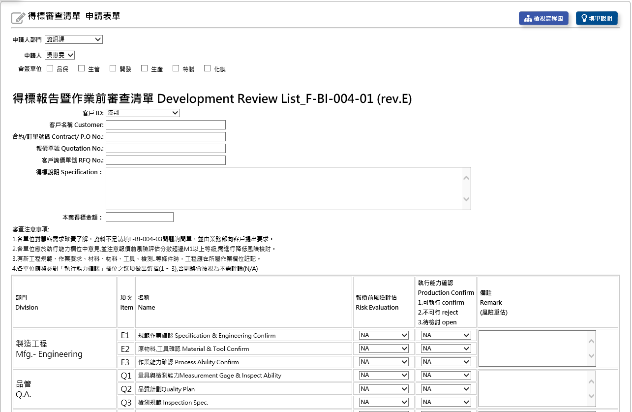 得標報告暨作業前審查清單:以前是類似紙本報告,需要各個單位主管去勾選哪些單位要填,然後各單位就會評估報價前風險評估,能不能執行去做確認,或是新接的專案時,他們就是要讓現場各單位去做一個評估,這專案是可行或不可行。