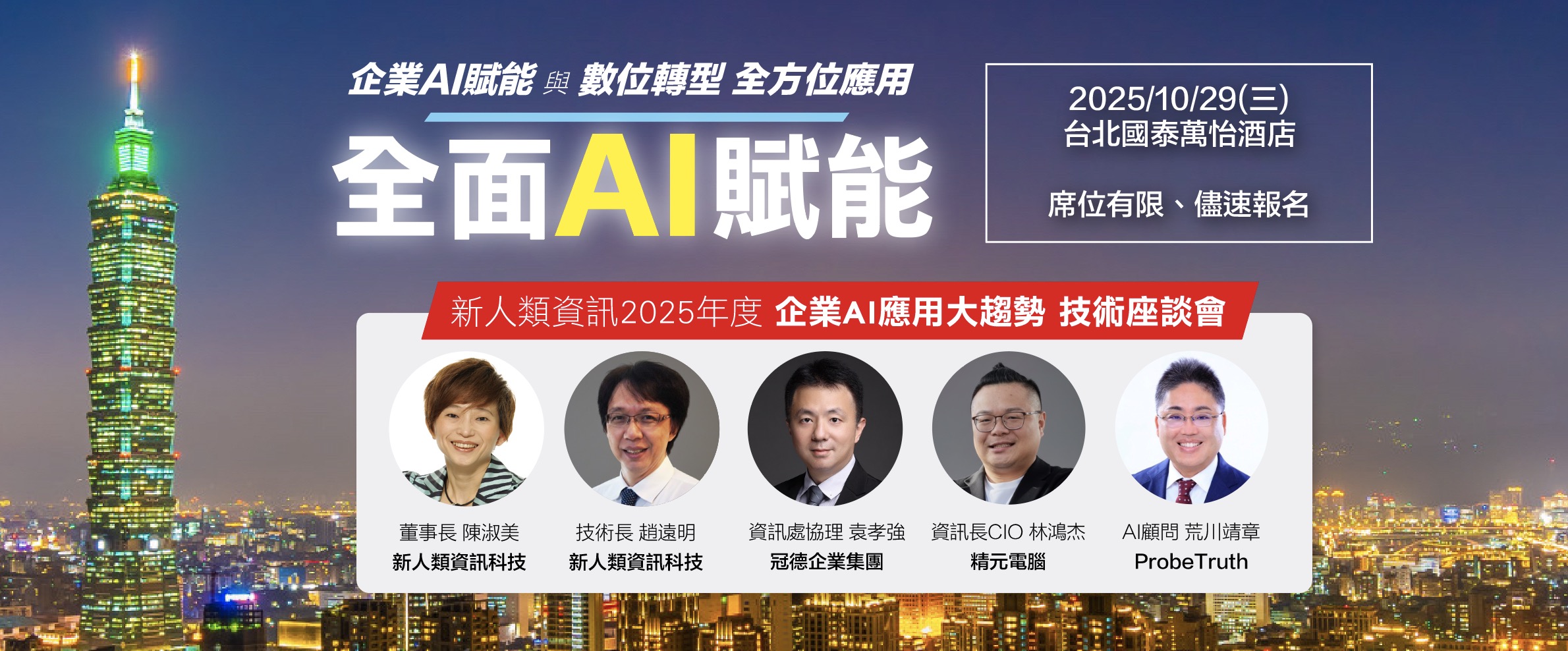 新人類即將於10/29(三)舉辦新人類2025年度【企業AI人工智慧技術應用】高峰會,發表新人類產品全系列AI應用解決方案!透過新人類豐富的「企業AI應用、數位轉型解決方案」產品群:Matrix企業平台、BPM商業流程、ISO制度永續、EIP團隊協同、PMIS專案任務、TOPSales業務/CRM客戶管理....一次全面AI賦能!