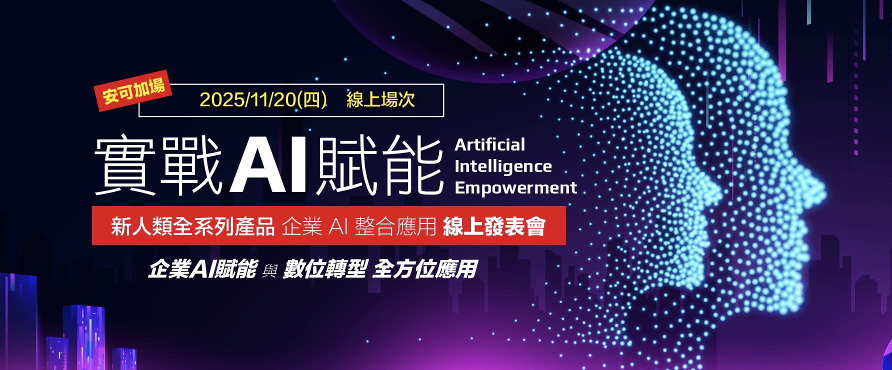 好評安可加場!11/20(四)新人類【企業AI人工智慧技術應用】線上安可加場發表會,發表新人類產品全系列AI應用解決方案! 透過新人類豐富的「企業AI應用、數位轉型解決方案」產品群:Matrix企業平台、BPM商業流程、 ISO制度永續、EIP團隊協同、PMIS專案任務管理....一次全面AI賦能!