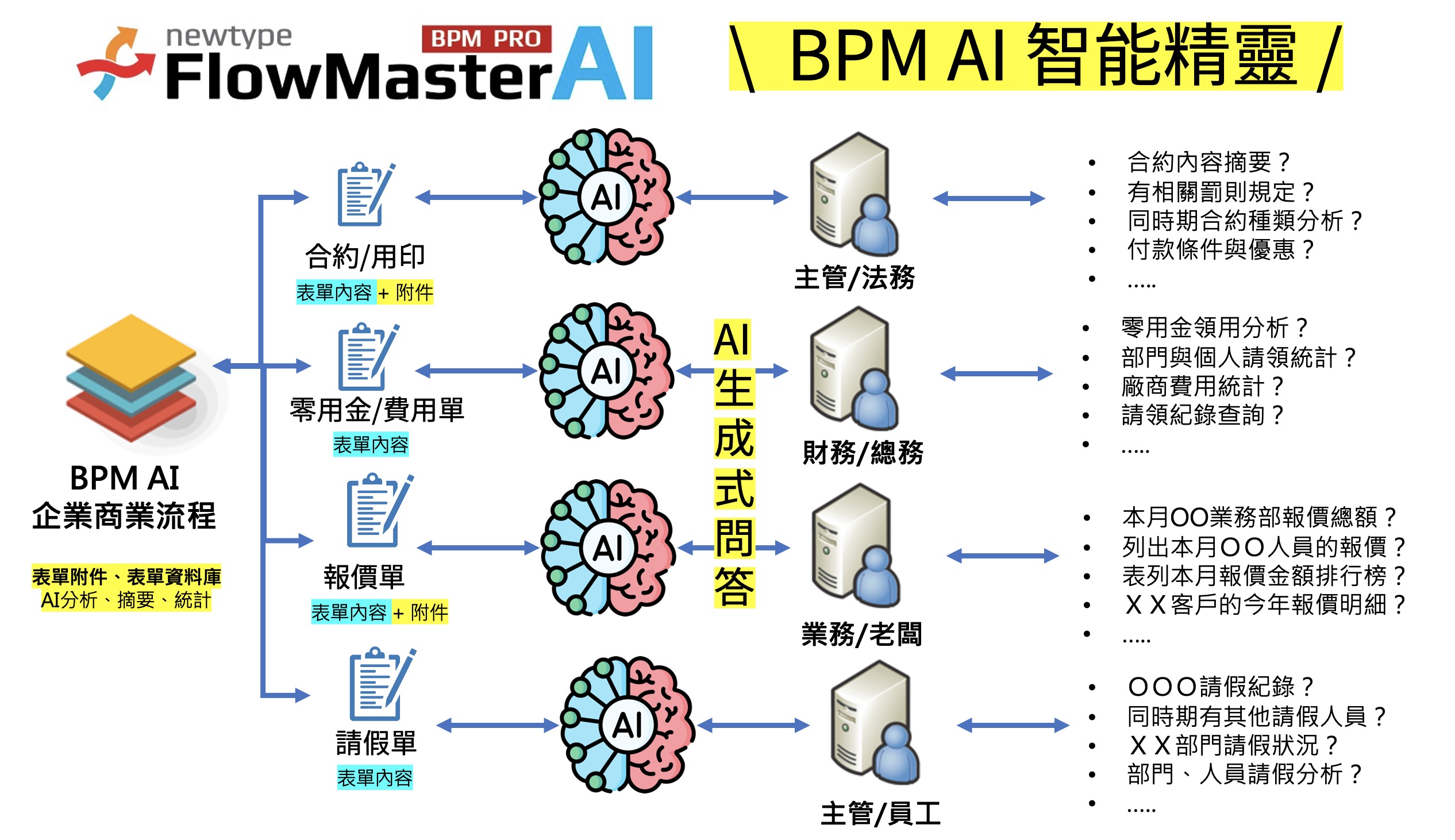 大受老闆與主管歡迎最強大新功能!全新的BPM AI智慧精靈,簽核者只要針對表單附件、表單資料分析、統計有任何需求...。