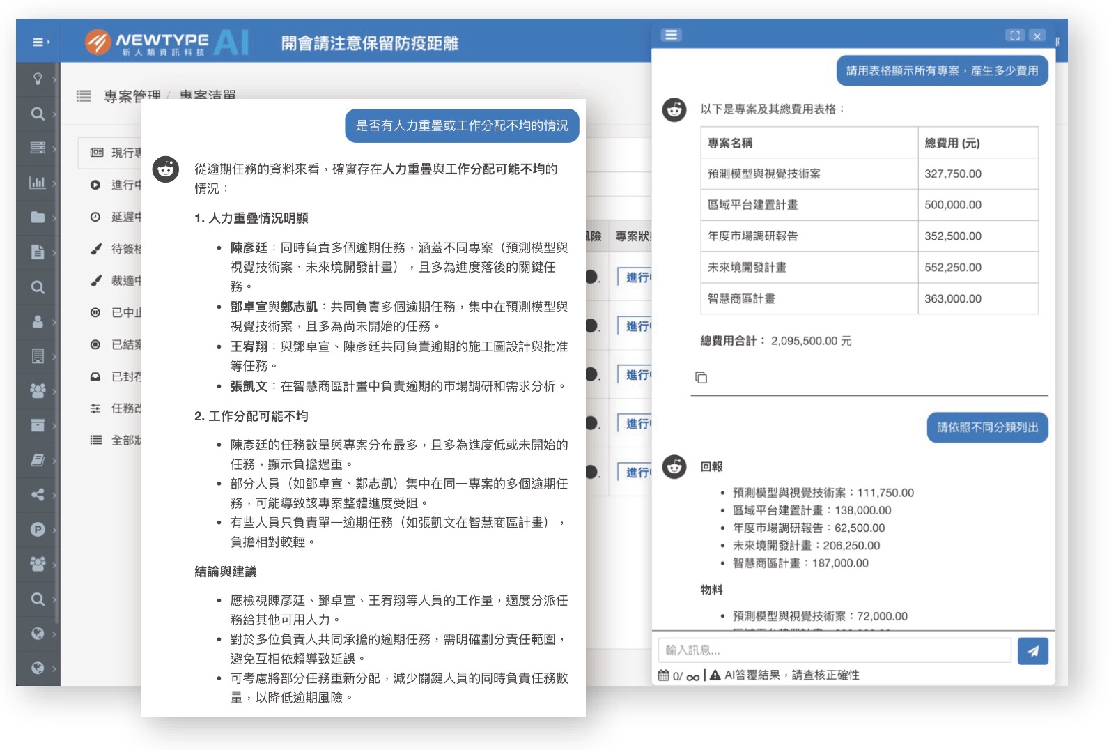 WebPMIS AI整合AI人工智慧技術,可以透過AI諮詢與問答,獲得更多即時專案、任務、人力、進度、成本的分析與建議。
