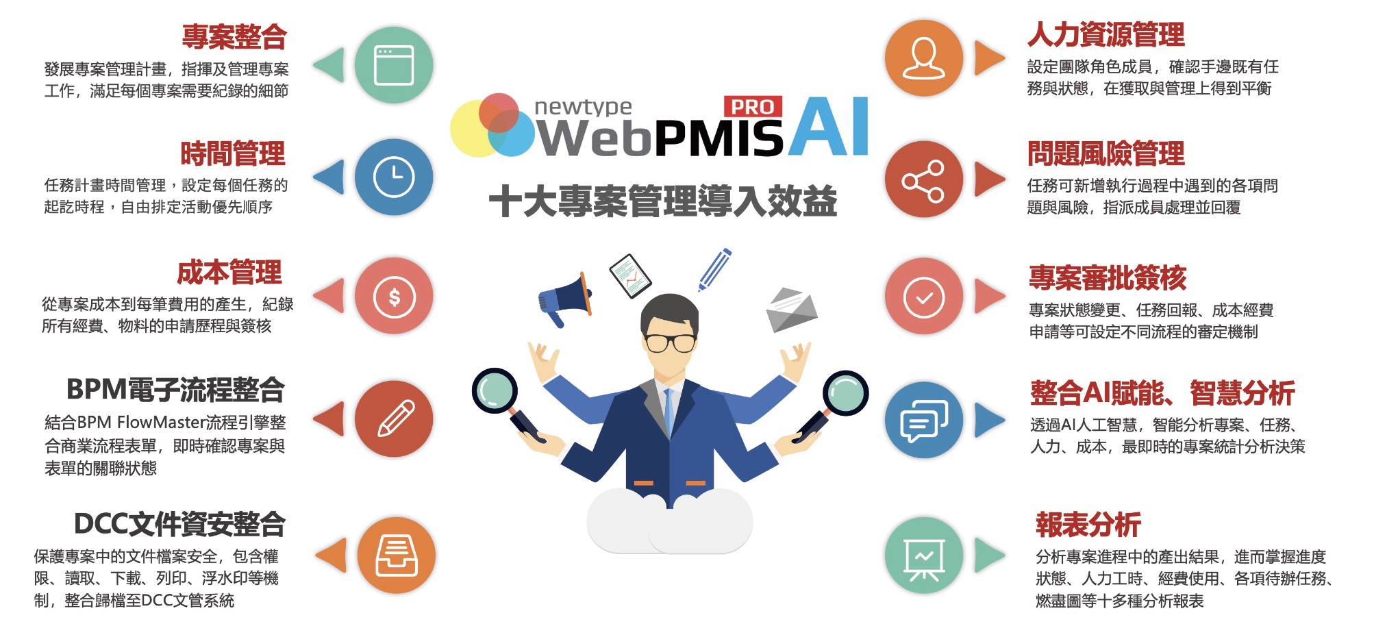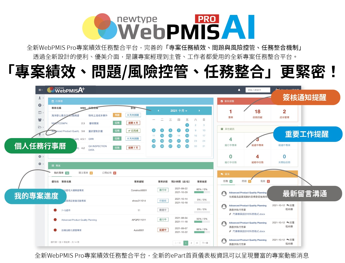 五大類50多項模組架構! 全新的WebPMIS Pro內建豐富的五大類50多項專案模組架構功能,結合全新世代的NewType企業級管理平台架構,可以整合 旗下:WebISO品質文件安控管理平台、FlowMaster BPM Pro企業商業流程管理平台,甚至最新推出的TOPSales頂尖業務雲平台, 是專案管理中最具高效率管理、更簡單好用、功能卻一點也不馬乎的最佳專案績效管理整合平台!