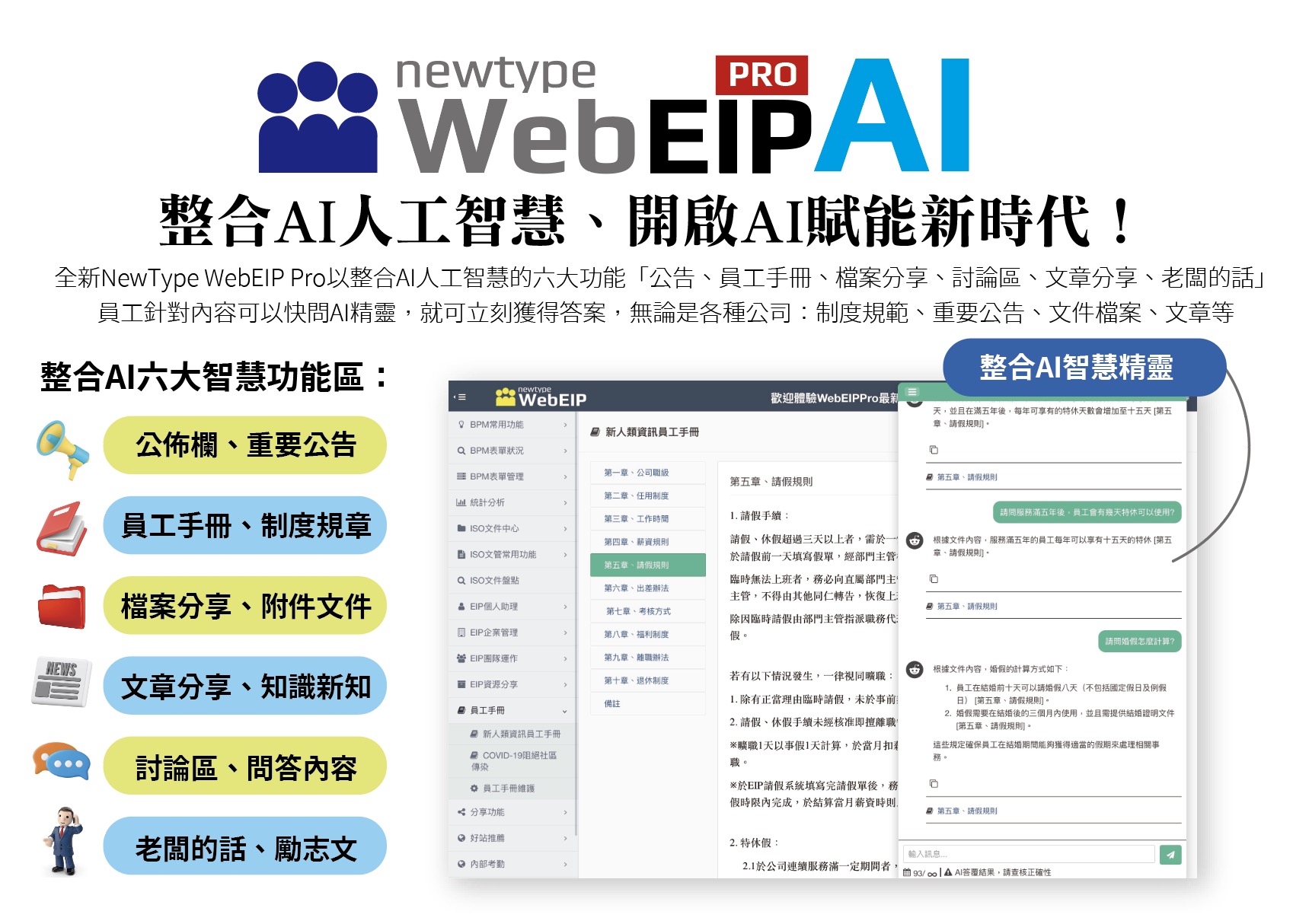 公司規章制度:員工手冊 我們了解企業有許多規章、辦法的內容,透過WebEIP內建高彈性的:員工手冊機制,讓員工快速了解公司的完整制度規章說明。