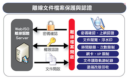 WebISO創新專利「一次性隨機密碼」文件保護技術,透過離線檔案申請、下載、回收...等作業機能,可保持離線檔案閱讀性,卻又可控制開啓對象、時間與電腦環境,避免重要機密文件外流。