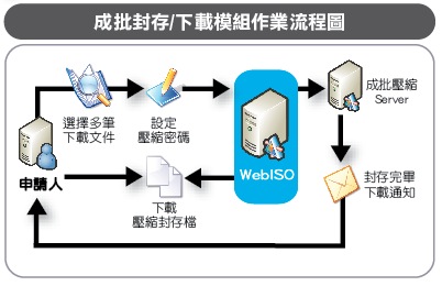 全新WebISO PRO版成批文件封存/下載模組,可以快速將多個文件中的附件檔案,快速成批壓縮下載文件檔案,並且保留了權限控管、浮水印等機制,可依照權限控管是否可下載原始檔、PDF檔案,也可限制僅特定對象可以申請成批下載,提供兼顧安全與便利的機制。